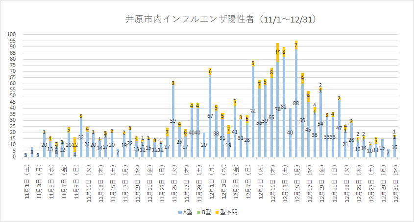 ※12/11 ・・・ 30代型不明1名・40代型不明1名はコロナも同時陽性